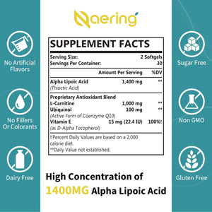 El suplemento lipoico del ácido alfa lipoico lipoico es un antioxidante potente y coenzima esencial. A medida que envejecemos, los niveles naturales de ácido alfa ipoico disminuyen, lo que hace que la suplementación sea crucial. No te conformes con ácido alfa lopoico de 600 mg, 200 mg o 300 mg por porción, la fórmula Naering de 1400 mg de alta dosis es la opción superior de suplemento de ácido alfa-lipoico para ti.