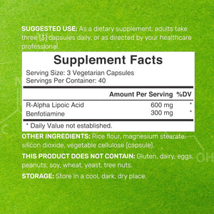 Dosis y porciones: 120 cápsulas vegetales por botella con 3 cápsulas vegetales por porción, contiene 600 mg de R-ALA con 300 mg de benfotiamina por dosis, hasta un suministro de 40 días.