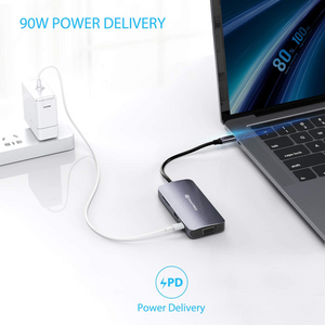 Potencia de 87 W USB C: soporta la carga PD 3.0 a un máximo de 20 V 3 A, este adaptador USB C de varios puertos proporciona puerto hembra de paso tipo C para la carga. Nota importante: la potencia máxima total es de 87 W y este concentrador se reserva un poco para su propio consumo de energía.