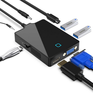 Adaptador USB C a VGA multifunción: amplía tu puerto USB C a un puerto HDMI, una salida VGA, un puerto de salida de audio, un puerto de alimentación externo de 0.138 in CC 5 V, USB 3.0 dual y un puerto de carga USB-C. Permite ampliar el escritorio a un monitor externo a través de cable HDMI y VGA; funciona perfectamente en juegos, trabajo y entretenimiento. (Nota: no es compatible con conectar nuestro hub al puerto USB del portátil mediante un adaptador USB a USB C).