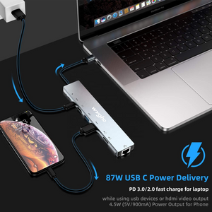 Ideal como un concentrador USB C para Mac Book Pro/USB C para viajar.Concentrador WYGHO USB C 8 en 1: adaptador USB compatible con macbook pro, funciona para los dispositivos MacBook Pro o USB-C más recientes con el concentrador USB-C multipuerto con un puerto Ethernet RJ45(1000 Mbps) 2 puertos de carga USB C, un puerto HDMI 4K @ 30Hz , un lector de tarjetas SD / TF, y 2 puertos USB 3.0, lo que le permite conectar un teclado, mouse, controlador USB, disco externo a MacBook Pro