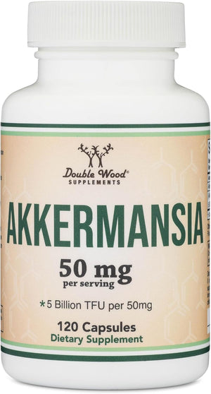 AKKERMANSIA MUCINIPHILA PROBIOTIC: El probiótico Akkermansia de Double Wood está estandarizado a 5 mil millones de TFU (unidades fluorescentes totales). Las pruebas de terceros muestran que el producto produce 50 mil millones de UFC por gramo