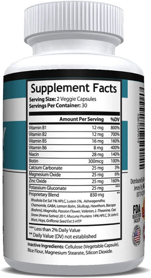 Vitamina B1, B2, B5, B6, niacina, biotina, carbonato de calcio, óxido de magnesio, óxido de zinc, gluconato de potasio, ashwagandha, manzanilla, gaba, bálsamo de limón, casquete, espino, bacopa, flor de la pasión, valeriana, l-teanina, st Hierba de John, lúpulo, 5-HTP