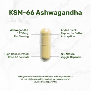 Características especiales: cápsulas vegetarianas de Ashwagandha extra fuerte de 1,200 mg. Fórmula KSM-66 de espectro completo de extracto de raíz. Mejorado con pimienta negra para una mejor absorción.