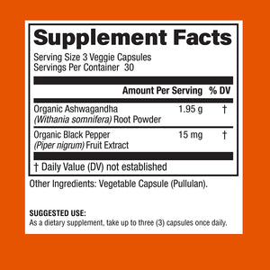 Polvo de raíz de Ashwagandha orgánico (withania somnifera), extracto de pimienta negra orgánico (Piper nigrum) (fruta), cápsula vegetal (hipromelosa y agua)
