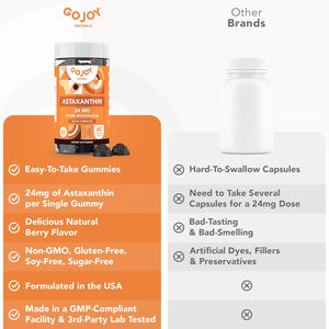 Fórmula en Gomas Deliciosas: Las gomitas de GoJoy son una forma sabrosa y conveniente de tomar astaxantina, haciendo que el suplemento sea fácil de incorporar a tu rutina diaria.