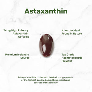 Características especiales: cápsulas blandas de astaxantina de 24 mg de doble fuerza cosechadas de microalgas islandesas prístinas. Proporciona astaxantina hematococo pluvialis de grado superior que conserva una rica fuente de antioxidantes y carotenoides.