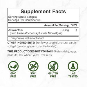 Dosis y porciones: una potente fórmula que ofrece 120 cápsulas blandas por botella y proporciona 24 mg de astaxantina pura por porción. Esto permite un suministro de hasta 2 meses.