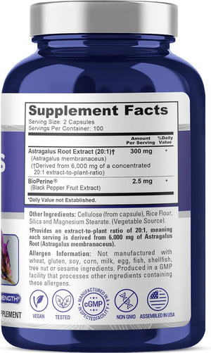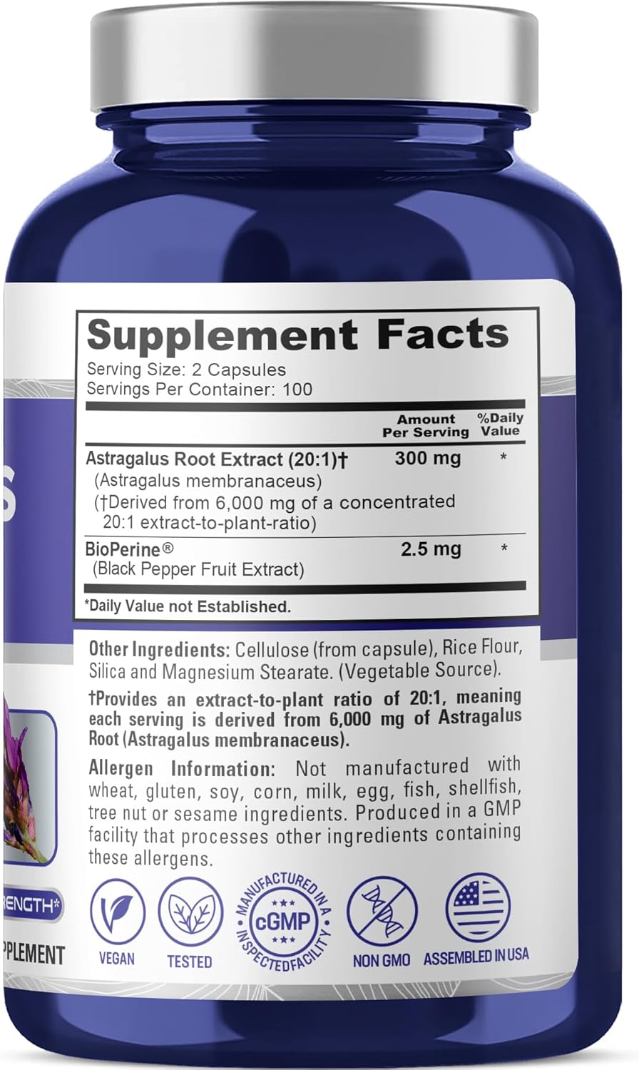 * FUERZA MÁXIMA Astrágalo (NO-OGM): el suplemento de astrágalo de fuerza máxima contiene 6000 mg de astrágalo por cápsula y 200 cápsulas en cada botella. El astrágalo ayuda a reducir la cantidad de óxido nítrico liberado por las células. No se conforme con otras tabletas o píldoras que solo ofrezcan 500 mg o 1000 mg de astrágalo por dosis. Ofrecemos 6000 mg de astrágalo por cápsula para una gran oferta.