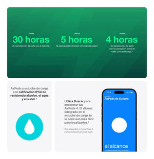 Al igual que la generación anterior, los AirPods 4 ofrecen una experiencia de escucha perfecta con los dispositivos Apple. A diferencia de la generación 3, los nuevos AirPods detectan automáticamente cuando te los quitas y pausan la reproducción para que nunca te pierdas nada. La arquitectura acústica recientemente mejorada mejora la calidad del audio y, al mismo tiempo, ofrece un mejor ajuste en tu oído. Con una clasificación IP54, los AirPods 4 están a salvo del sudor, el agua y el polvo. Los AirPods 4 incluyen un estuche de carga que cuenta con una conexión de carga USB-C.