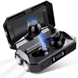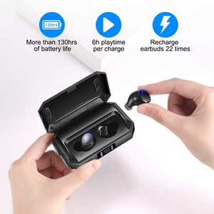 Larga duración de la batería: auriculares inalámbricos con funda de carga de 2600 mAh, que puede proporcionar más de 22 cargas y 130 horas de reproducción. Una carga completa proporcionará 6 horas de tiempo de escucha. La funda de carga cuenta con linterna y pantalla LED para indicar la duración de la batería, así como atracción magnética para una fácil colocación de auriculares. También puedes utilizar la funda de carga como un banco de energía para cargar tu smartphone.