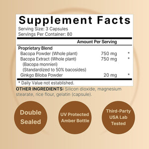 Con 240 cápsulas por botella, tamaño de porción de 3 cápsulas, ofrece 750 mg de polvo de bacopa con 750 mg de extracto de bacopa y 20 mg de ginkgo biloba en polvo por dosis, dura más de 2 meses (80 porciones).