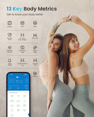 - 13 medidas corporales: Peso corporal, IMC, grasa corporal, porcentaje de agua, músculo esquelético, peso corporal libre de grasa, masa muscular, masa ósea, proteínas, BMR, grasa subcutánea, grasa visceral y edad metabólica.