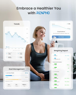 Supervise su progreso. RENPHO se conecta con las aplicaciones para ayudarlo a establecer objetivos, guardar datos históricos y realizar un seguimiento de su progreso diario, semanal y mensual.