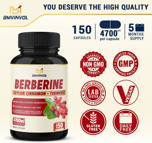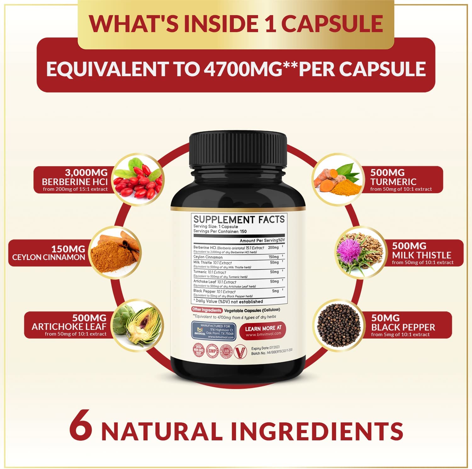 BMVINVOL Fórmula altamente concentrada: extraemos elementos clave de 6 ingredientes de hierbas naturales. Esto significa que una cápsula de berberina se deriva de 4700 mg de polvos de hierbas 150 capsulas suministro para 5 meses!!!