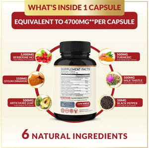 Hemos combinado una mezcla única de 6 extractos de hierbas de origen natural: berberina, canela de Ceilán, cardo mariano, cúrcuma, hoja de alcachofa, pimienta negra.