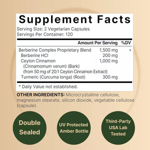 240 cápsulas vegetarianas por botella, tamaño de porción de 2 cápsulas, 1500 mg de berberina HCl 10:1 de raíz de Berberis Aristata y 10:1 de canela de Ceilán 1200 mg de corteza de canela verum por dosis.
