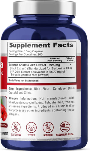 Berberine HCI 4500mg 200caps (sin OGM y sin gluten) Apoya los niveles saludables de azúcar en la sangre y el metabolismo, mejora la inmunidad y la digestión