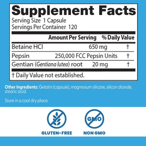 BETAINA HCI 650 MG CON PEPSINA 250000 FCC Y GENCIANA 20 MG 120 CASPULAS SIN GMO DOCTOR´S BEST