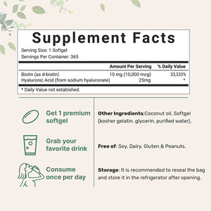 Un potente suplemento de biotina de 10000 mcg que se deriva de D-biotina premium, así como contiene 25 mg de ácido hialurónico de hialuronato de sodio. Cada bolsa ofrece un suministro de año completo que solo necesita un solo tamaño de porción de gel suave para promover la confianza general, dentro y fuera.