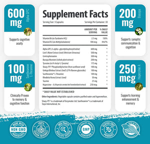 NO OGM Y VEGANO: nuestro suplemento inteligente para el cerebro Fabricado en los EE. UU. En un laboratorio cGMP aprobado por la FDA sin lácteos, gluten, soja, huevo, pescado, nueces u otros alérgenos. Nuestros productos tampoco contienen conservantes artificiales, contaminantes, productos animales o ingredientes artificiales.