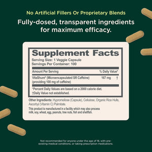 Sin nerviosismo sin choque: La cafeína regular te da una sacudida rápida seguida de una inevitable caída de energía. Genius Caffeine ofrece 100 mg de cafeína de liberación sostenida por cápsula, manteniéndote alerta y concentrado sin altibajos repentinos