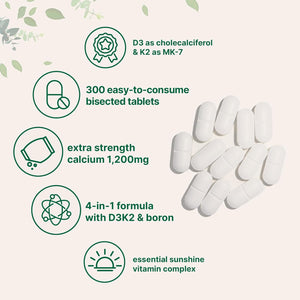 - Cada bolsa contiene 300 comprimidos recubiertos y bisecados, que proporcionan 25 mcg (1,000 UI) de vitamina D3, 25 mcg de vitamina K2, 1,200 mg de calcio y 2 mg de boro por porción.