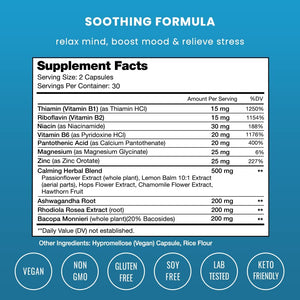 Fórmula limpia, sin efectos secundarios: con su mezcla de ingredientes a base de hierbas clínicamente probada, la fórmula calmante a base de hierbas de CalmSense es suave y segura, sin efectos secundarios. Los ingredientes incluyen Ashwagandha, Rhodiola Rosea, manzanilla, flor de la pasión, bacopa monnieri, bayas de espino, extracto de lúpulo, bálsamo de limón, magnesio y más.