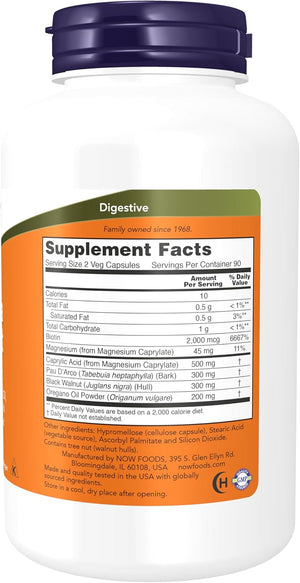 Combinación de ingredientes herbales (Pau D'Arco, Nogal Negro y Aceite de Orégano), Biotina (una vitamina del complejo B) y ácido caprílico