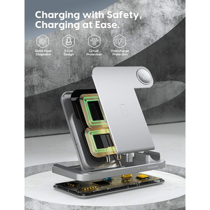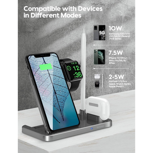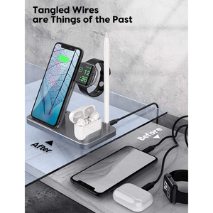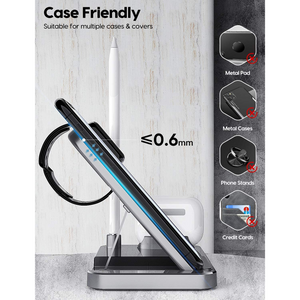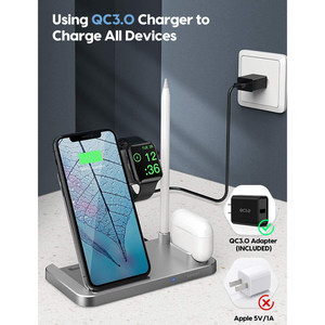 Estación de carga inalámbrica 4 en 1: puedes cargar tus productos de Apple simultáneamente con este soporte de cargador inalámbrico 4 en 1. Carga tu iPhone, iWatch, AirPods y Apple Pencil al mismo tiempo. Alimentado por adaptador QC3.0 (no incluido), el soporte de carga tiene salidas de hasta 10 W para teléfonos, 5 W para AirPods, 3 W para iWatch, y 2 W para Apple Pencil 1.Carga segura con certificación Qi: con avanzada certificación Qi, la base de carga inalámbrica rápida te proporciona una experiencia de carga segura. Adopta protección contra sobrecorriente, protección contra sobretensión, técnicas de protección de sobrecarga y agujeros de disipación de calor masivos, asegurando tu carga segura.