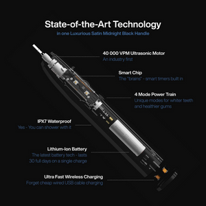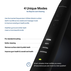 40,000 VPM cepillo de dientes eléctrico: belleza, cerebro y potencia. El cepillo de dientes Black Series es un cepillo de dientes eléctrico moderno de clase mundial con la tecnología más moderna. Cuenta con un motor ultra potente y líder en la industria que produce 40,000 vibraciones por minuto, carga inalámbrica ultrarápida, operación de 4 modos, temporizadores de vibración inteligentes, 8 cabezales y cerdas diseñados por DuPont y un estuche de viaje personalizado; todo con un diseño impermeable ultradelgado, liviano y con clasificación IPX7.Una limpieza completa: AquaSonic elimina 10 veces más placa a lo largo de la línea de la encía que un cepillo de dientes manual y 3 veces más placa que los cepillos de dientes eléctricos anticuados. El modo de blanqueamiento ayuda a blanquear los dientes mediante el uso de frecuencias invertidas para disolver las manchas superficiales. El modo de masaje va más allá de los dientes para mejorar la salud de las encías ofreciendo microburbujas relajantes en los tejidos para mejorar la circulación y la salud general.