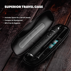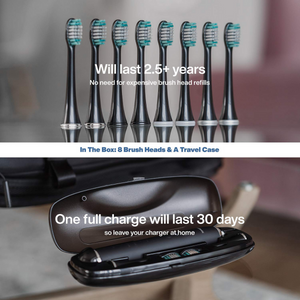 Cabezales de cepillo de 8 dientes y funda de viaje incluidos. Cada cepillo de dientes de la serie Black viene con 8 cabezales de cepillo diseñados por el mundialmente famoso DuPont; un líder mundial en ciencia de calidad y materiales. Cada cepillo dura 4 meses, por lo que 8 durarán más de 2.5 años. También se incluye una práctica funda de viaje hecha de plástico sin BPA con espacio para dos cabezales de cepillo. AquaSonic puede durar 4 semanas completas (2 min/2 veces al día) con una carga completa, por lo que es perfecto para viajes en movimiento con la funda de viaje incluida.