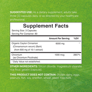240 cápsulas en total por botella que contienen polvo de canela cruda de un extracto 10:1. Porción de 3 cápsulas que equivale a un suministro de hasta 80 días. Cada dosis proporciona 6000 mg de canela con 1000 mcg de picolinato de cromo . La combinación de canela de la más alta calidad con el mineral esencial cromo ofrece apoyo complementario en todo el cuerpo para que pueda disfrutar de propiedades activas naturales con bajos niveles de cumarina .Ingredientes no modificados genéticamente que son probados y aprobados por laboratorios de terceros. Hecho sin gluten, lácteos, huevos, cacahuetes, soja, trigo y levadura.