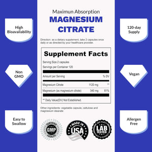 - Alta absorciónMagnesio: Característica citrato magnesio que es altamente absorble