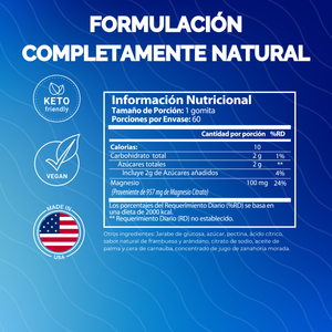 Ingredientes de Alta Calidad: Nuestras gomitas están elaboradas en USA con ingredientes naturales, sin gluten, sin colorantes ni conservantes artificiales. Cada gomita está diseñada para garantizar una dosis precisa de magnesio y un sabor delicioso.