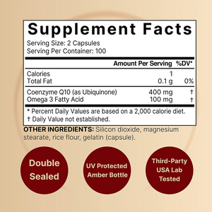 Potente mezcla de CoQ10 y Omega-3: nuestra fórmula de alta potencia combina 400 mg de CoQ10 (Ubiquinona) y ácidos grasos Omega-3 para mejorar la salud cardíaca, los niveles de energía y la protección antioxidante.