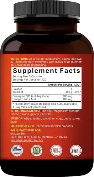 - Potente mezcla de CoQ10 y Omega-3: Fórmula de alta potencia combina 300 mg de CoQ10 (Ubiquinona) y 100 mg de ácidos grasos Omega-3 para mejorar la salud cardíaca, los niveles de energía y la protección antioxidante.