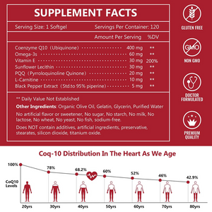 Salud cardiovascular: La CoQ10 ayuda a mantener la salud del musculo cardiaco, promueve una circulacion sanguinea adecuada y puede ayudar a reducir la presion arterial en personas con hipertension.