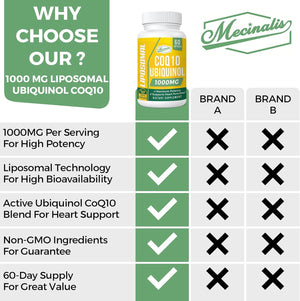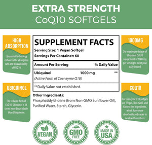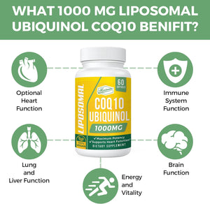 Potencia máxima de CoQ10 de 1000 mg--3 veces mejor absorción con Ubiquinol CoQ10--5 veces mejor absorción con tecnología liposomal--Cápsula blanda vegana sin OGM--Hecho en los EE. UU.