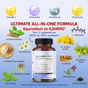 Fusión única: este suplemento combina vitamina C, vitamina D3, vitamina B6, magnesio, ashwagandha, L-teanina, manzanilla, 7 extractos de una mezcla patentada y pimienta negra.