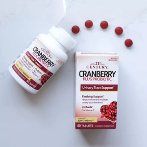 Los comprimidos de Arándano rojo con probióticos de 21st Century® ofrecen una manera conveniente de obtener los beneficios del zumo de arándano rojo sin el sabor agrio ni el azúcar agregado. Ahora puede dejar de tomar el vaso de zumo de arándano rojo y obtener su porción diaria en 2 comprimidos pequeños.