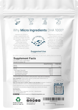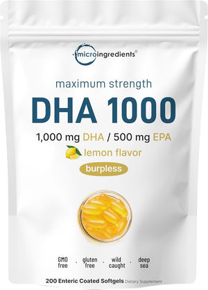 Micro Ingredients ofrece cápsulas blandas DHA de 1000 mg extra fuertes. Impregnado con un sabor dulce a limón y fabricado con tecnología de revestimiento entérico sin rebabas. Conserva los niveles esenciales de aceite de pescado omega-3 EPA DHA de peces frescos noruegos capturados en la naturaleza.