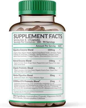 Enzimas digestivas 1000MG Plus Suplemento de prebióticos y probióticos, 180 cápsulas, fórmula vegana orgánica