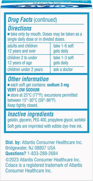 Alivio eficaz y cómodo: los geles suaves Colace Clear Stool Softener tratan eficazmente el estreñimiento ocasional; incluyendo el estreñimiento asociado con ciertas condiciones médicas; es una opción segura y suave; sin ningún laxante estimulante.
