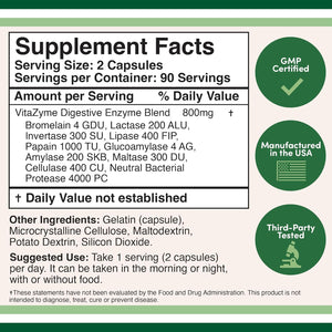- Contiene las 10 enzimas digestivas más esenciales: Ninguna otra mezcla de enzimas digestivas contiene las 10 enzimas digestivas más esenciales, incluyendo amilasa, lipasa, bromelina, lactasa, papaína, proteasa, celulasa, maltasa, invertasa y glucoamilasa