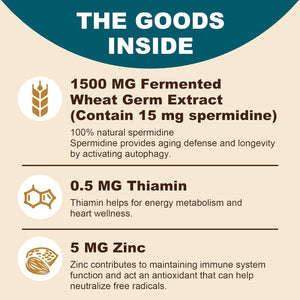 Con tiamina y zinc, mejora la renovación celular y la longevidad: nuestra mezcla de espermidina incluye zinc y tiamina. El zinc ayuda a mantener la función del sistema inmunológico y actúa como antioxidante, ayudando a neutralizar los radicales libres. La tiamina ayuda en el metabolismo energético y la salud del corazón. La espermidina juega un papel crítico en la defensa del envejecimiento y la longevidad mediante la activación de la autofagia, la renovación celular y el proceso de reciclaje.