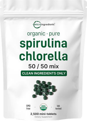 - Mini-tabletas de espirulina orgánica pura (pared celular rota), hechas de clorella orgánica y espirulina en polvo en una mezcla 50/50, 2,000 mg por porción, 2,500 mini tabletas (250 porciones), tamaño fácil de tragar, sin relleno e irradiación, superalimento de algas verdes y vegano amigable.