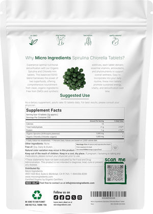 ESPIRULINA 1,000 MG CLORELLA 1,000 MG MICROINGREDIENTS 2,500 MINI TABLETAS SIN GMO