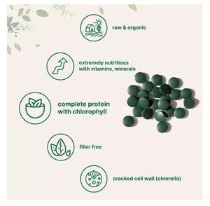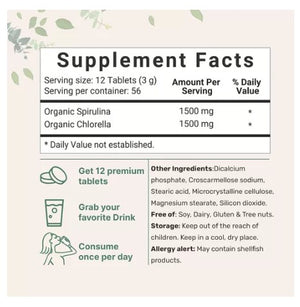 Suplemento orgánico de clorella y espirulina premium, cargado con proteína vegana, clorofila, fibra, aminoácidos (Omega 3 6 9, GLA, argininina), ácidos grasos, vitaminas inmunes (vitamina A, vitamina B2, vitamina B12, vitamina C, vitamina K, biotina), minerales y fácil de tragar.