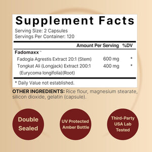 Fórmula de Alta Potencia: Con 600 mg de Fadogia Agrestis y 400 mg de Tongkat Ali por porción, este suplemento ofrece una dosis concentrada para aquellos que buscan un soporte adicional en su rutina diaria.